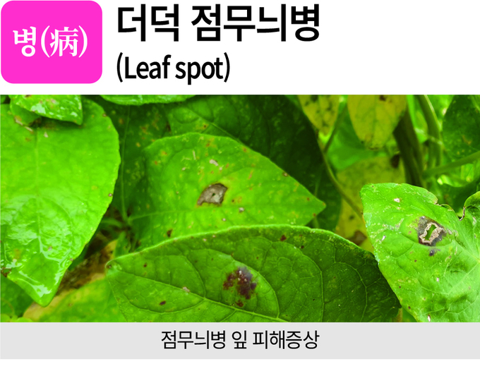 작물별 병해충 및 잡초에 대한 세부 설명과 사진을 활용한 이해를 통해 올바른 적기 방제에 도움을 주기 위한 연재 「방제도감-병충초(病蟲草) 바로알기!」 스물일곱 번째 코너. 이번 호에서는 더덕 점무늬병과 응애/잎응애과 해충인 점박이응애, 화본과 잡초인 개피에 대해 알아본다. 더덕은 한국의 전통적 산나물로 독특한 향과 맛, 다양한 건강 효능을 지녀 자연의 산삼으로 불린다. 농촌진흥청이 신속한 조기경보와 대응으로 농작물 피해를 줄이고자 운영하는 ‘국가농작물병해충관리시스템((NCPMS)’ 중 농작물에 대한 다양한 병해충 정보를 제공하고 있는 ‘병해충별 도감정보’ 자료를 인용했다.