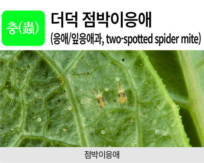 방제방법=하위 잎에서 발생이 상위 잎으로 확산된다. 발생지점에 물을 뿌려주면 억제된다. 재배 후에 작물 잔재물을 깨끗이 청소하여 발생원을 없애야 한다. 발생초기에 약제를 살포하는 것이 좋다. 잎응애는 약제저항성이 쉽게 발달하므로 같은 계통의 약제를 계속 사용하지 말아야 한다. 국내에 상업적으로 이용되는 천적으로 칠레이리응애, 사막이리응애, 긴털이리응애, 꼬마무당벌레 등이 있다. 밀도가 높으면 잔류기간이 짧은 등록약제를 살포한 후 천적을 방사한다.