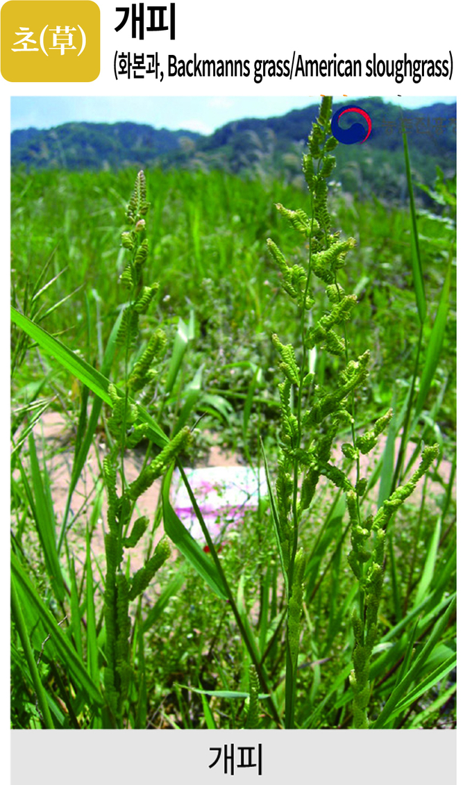 형태=초장 30~90㎝이다. 줄기는 총생하고 전체가 밝은 녹색이다. 잎은 분록색으로 편평하고 길이 7~20㎝, 나비 5~10㎜이며 거칠으나 털이 없고 가장자리에 잔톱니가 있다. 엽설은 난형 또는 삼각형으로 길이 3~6㎜이며 엷은 막질이고 엽초는 마디 사이보다 길다.