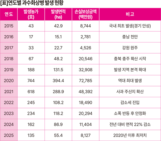 과수화상병의 명확한 유입경로는 밝혀지지 않았지만 국내에서는 비교적 최근인 지난 2015년 경기도 안성의 한 배 과수원에서 처음 발생(43농가 42.9ha)된 것으로 보고되고 있다. 이후 소폭의 등락을 반복해 오다 2019년(188농가 131.5ha)에 이어 2020년 744농가에서 394.4ha에 이르는 최다 발생에 이르게 되었다. 그러나 이후 꾸준히 줄어들어 특히 2025년 발생 면적은 55.4ha로서 최대 발생해이며 정점이었던 2020년과 비교하면 무려 85.9%가 줄어든 약 14% 수준에 불과했다. 2024년 86.9ha와 비교해도 36.2% 감소한 것이다. 이에 따라 손실보상금 지급액도 2020년 728억 원에서 2025년에는 81억 원으로 감소하였으나 타작물에 비하면 여전히 규모가 작지 않다.[표]