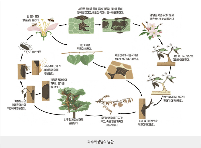 사과나 배 같은 장미과 식물에 발생하는 치명적 세균성 질병 ‘과수화상병(Fire Blight)’ 얘기다. 마치 나무가 불에 탄 것처럼 잎과 줄기가 검게 변하며 말라죽는 증상 때문에 붙여진 이름이다. 법정 검역 병해충으로 지정되어 농가에 막대한 경제적 피해를 줄 수 있는 매우 위험한 질병이다. 발생 시 전체를 매몰해야 하는 특성 때문에 ‘과수의 구제역’으로 불리우며 축산업의 구제역에 비유되기도 한다.