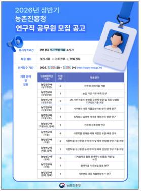 농촌진흥청(청장 이승돈)은 케이(K)-농업기술을 개발도상국에 전파할 코피아(KOPIA)센터 소장을 공개 모집한다. 농진청이 2026년도 코피아(KOPIA) 센터 소장 채용 선발 계획을 공고했다. 이번 공고를 통해 5개 국가(네팔, 도미니카(공), 세네갈, 에콰도르, 에티오피아) 코피아(KOPIA) 센터 소장 총 5명을 선발한다. 지원 자격은 농업 분야 7년 이상 경력자 또는 박사학위 취득 후 농업 분야 경력 3년 이상인 전문가이다. 응시원서는 1월 2일부터 11일까지 코피아(KOPIA) 누리집 원서 접수 시스템(http://itcc.rda.go.kr)을 통해 접수할 수 있다. 농진청은 서류 평가, 외국어·컴퓨터 능력검정 및 발표평가를 거쳐 최종 합격자를 선발할 예정이다. 자세한 내용은 농촌진흥청 누리집(http://www.rda.go.kr)에서 확인하거나, 국외농업기술과(063-238-1172)로 문의하면 된다. 해외농업기술개발사업(KOPIA; Korea Partnership for Innovation of Agriculture)은 농진청이 주관하는 국제개발 협력사업으로서 개발도상국 현지 맞춤형 농업기술 개발 보급을 통해 협력 대상국의 농업 생산성 향상 및